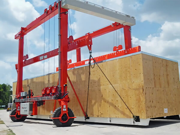 The double beam wheel gantry crane is a type of gantry crane with a horizontal bridge structure consisting of two parallel main beams, which is supported by tires and travels on the ground without rails.