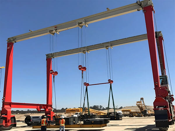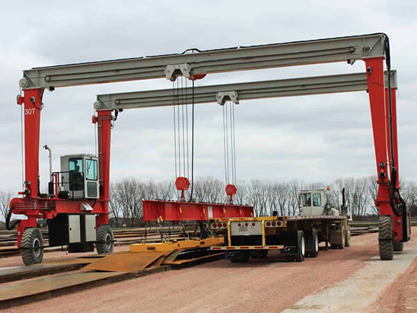 The double beam wheel gantry crane is a type of gantry crane with a horizontal bridge structure consisting of two parallel main beams, which is supported by tires and travels on the ground without rails. The gantry structure is formed by connecting the main beam with rigid and flexible support legs, and the main beam is usually designed as a box shaped double beam to enhance stiffness; The power system is mostly driven by internal combustion engines (such as diesel engines), which use electric motors to achieve walking, lifting, and variable amplitude mechanism actions. It has good maneuverability and can flexibly turn and transfer work positions in yards and other places